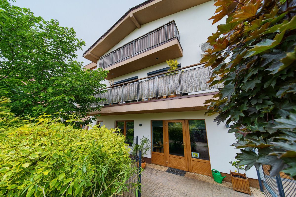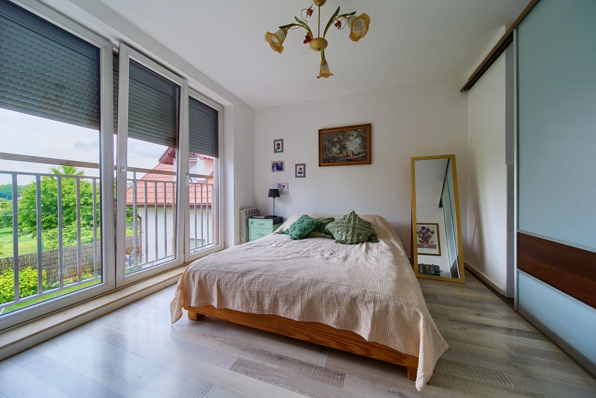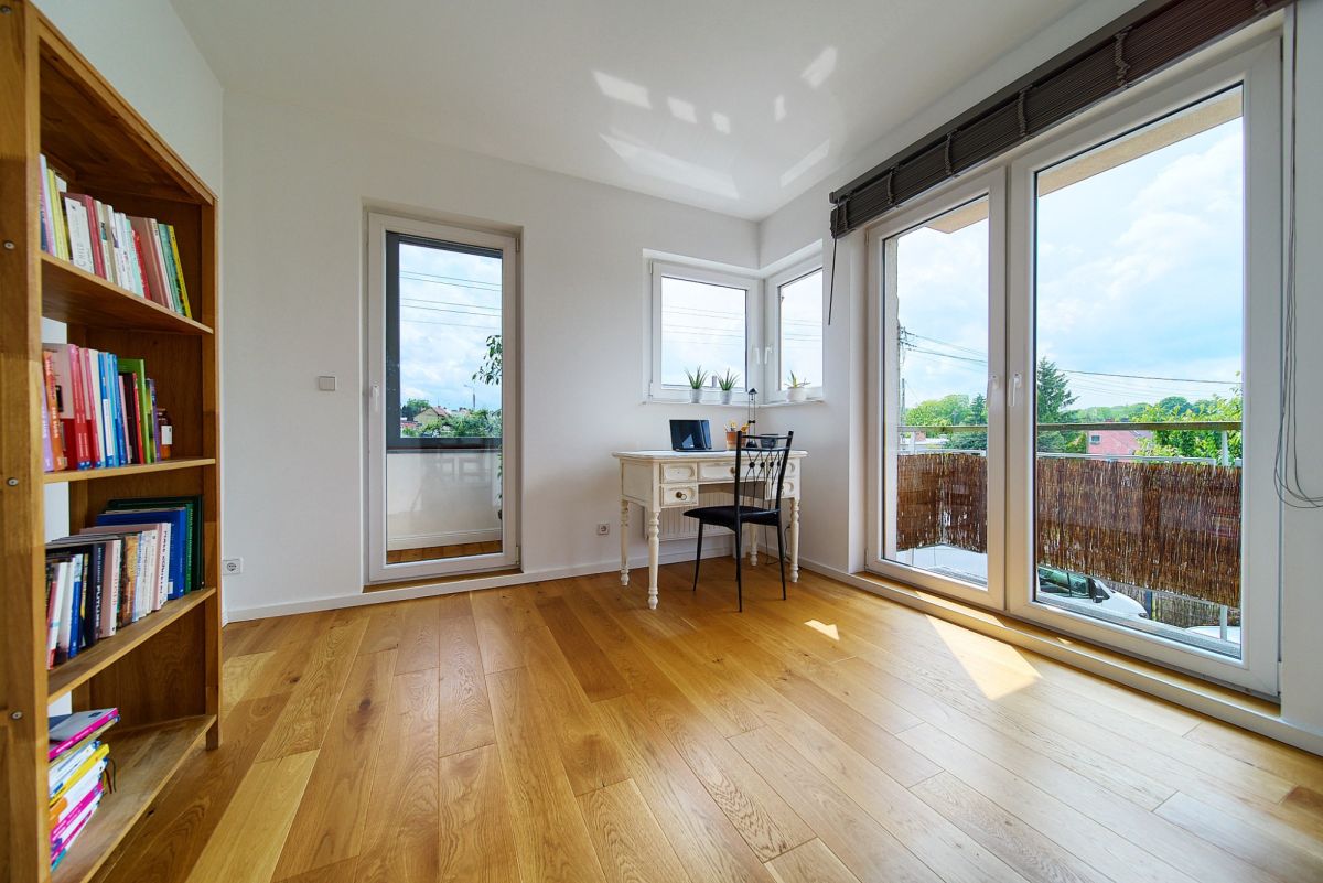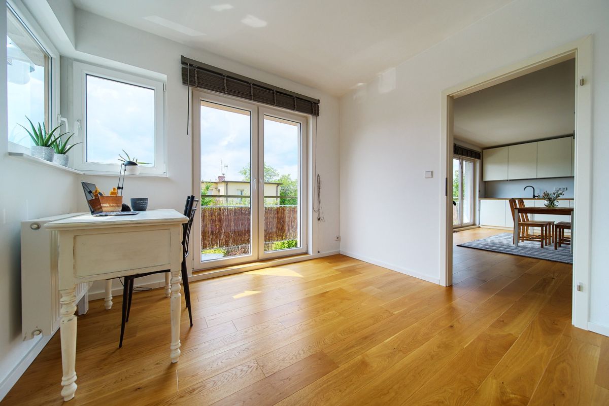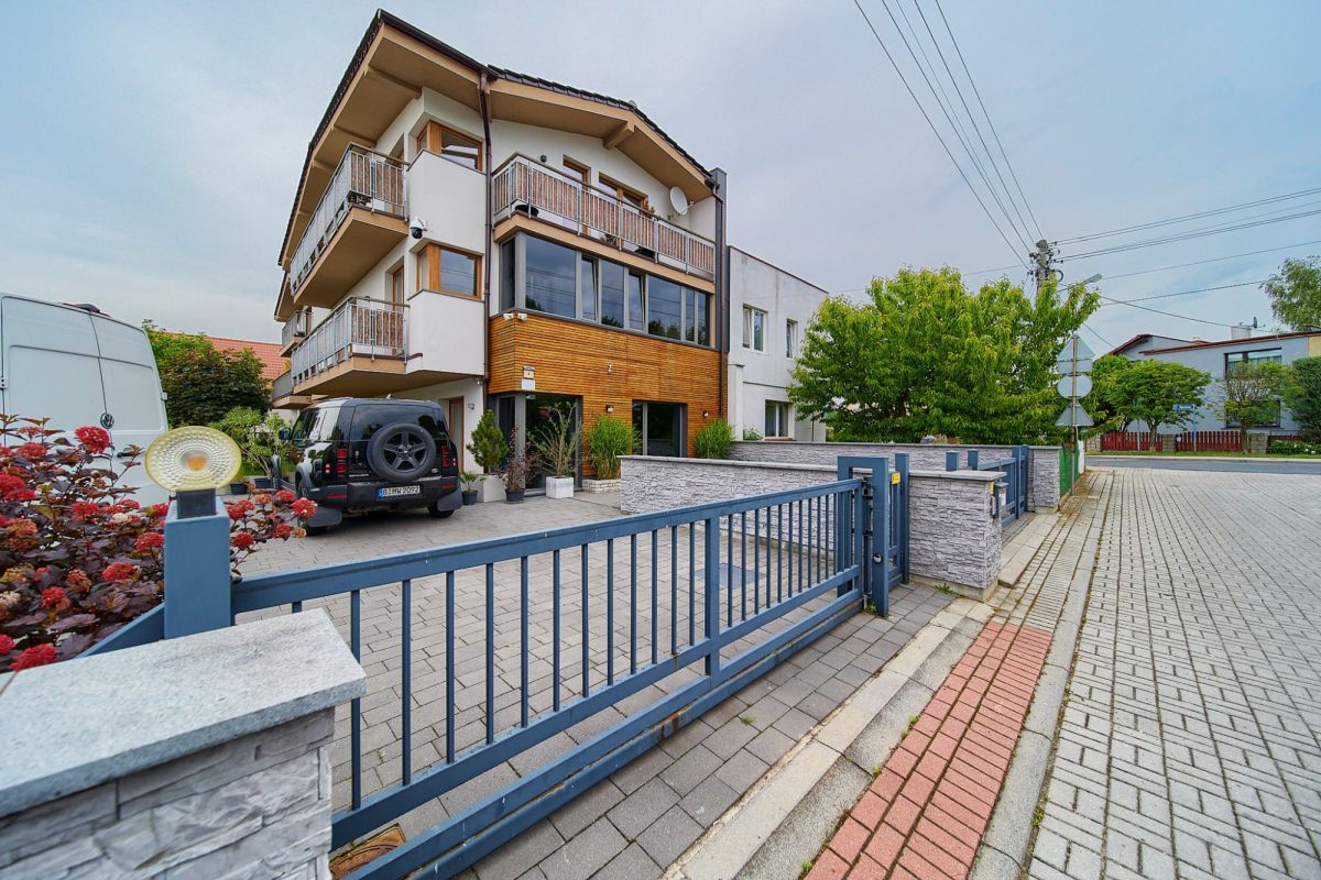 Jako doskonałe uzupełnienie nowoczesnego budynku wielofunkcyjnego, na terenie posesji znajduje się również urokliwy, wolnostojący dom jednorodzinny, wybudowany w 2001 roku. Oferuje on bardziej tradycyjny układ mieszkalny i pełnię prywatności. Na parterze domu znajdziemy otwartą strefę dzienną z salonem i funkcjonalnym aneksem kuchennym, dodatkowy, wszechstronny pokój idealny na gabinet lub gościnną sypialnię, oraz łazienkę. Piętro to typowa strefa nocna z trzema przytulnymi sypialniami oraz drugą, komfortową łazienką. Dom ten posiada bezpośrednie wyjścia na słoneczny taras z widokiem na ogród oraz dodatkowe, boczne wyjście na taras - idealne miejsca do wypoczynku na świeżym powietrzu. Zewnętrzne rolety zapewniają mieszkańcom większą prywatność i bezpieczeństwo, a praktyczne wejście na strych oferuje cenną, dodatkową przestrzeń do przechowywania.