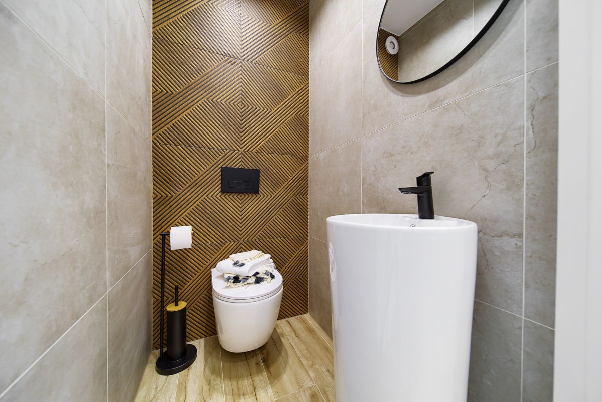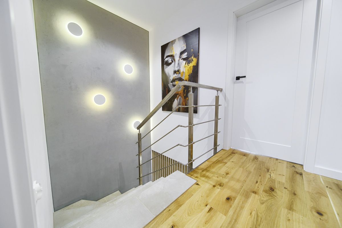 Dom sprzedawany jest w standardzie, który pozwala na natychmiastowe zamieszkanie. Wnętrza są wykończone: ściany pomalowane, na podłogach wysokiej klasy panele i płytki, zamontowana instalacja oświetleniowa. Łazienki są w pełni urządzone (glazura, armatura, sanitariaty). Przewidziano również miejsce na zabudowę kuchenną i szafy. (Uwaga: Prezentowane zdjęcia przedstawiają przykładową aranżację wnętrza w oferowanym standardzie premium - szczegółowy zakres materiałów omawiamy telefonicznie).