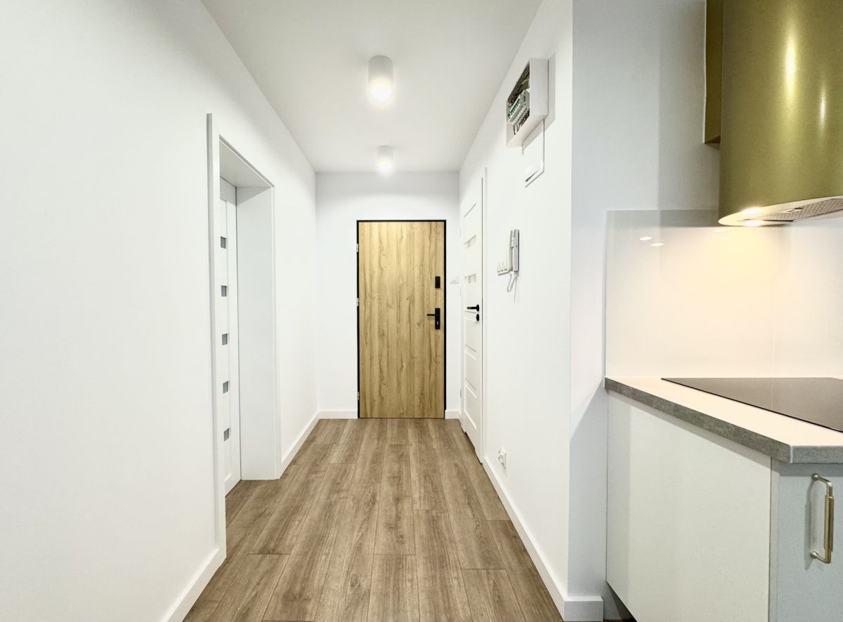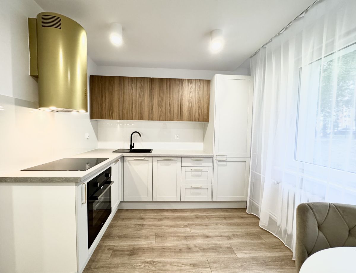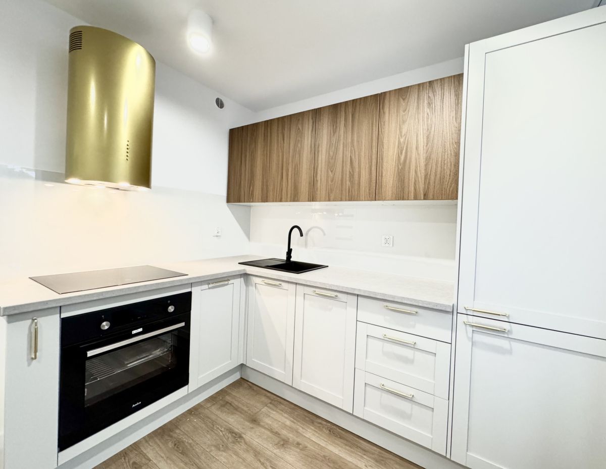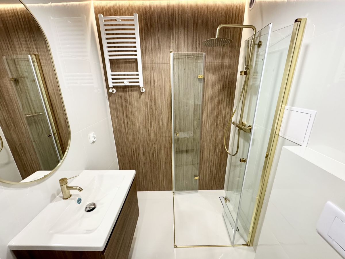 Mieszkanie przeszło kapitalny remont obejmujący wymianę wszystkich instalacji. Ściany i sufity pokryte zostały płytami, aby uzyskać idealnie równe powierzchnie, następnie wykończone gładziami. Na podłogę położono masę samopoziomującą oraz wysokiej jakości panele. W łazience zainstalowano nowoczesną kabinę prysznicową z odpływem liniowym. Kuchnia wyposażona została w wysokiej klasy meble kuchenne wraz z kompletnym sprzętem AGD do zabudowy: lodówką, piekarnikiem, płytą indukcyjną oraz okapem. W pokoju zamontowano dużą szafę narożną oraz elegancki stolik kawowy. Całość wykończona pod klucz - mieszkanie nie wymaga żadnych dodatkowych prac.