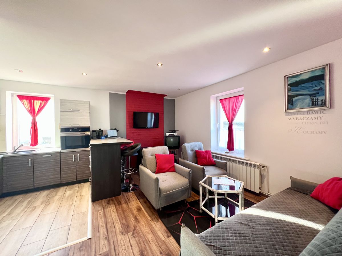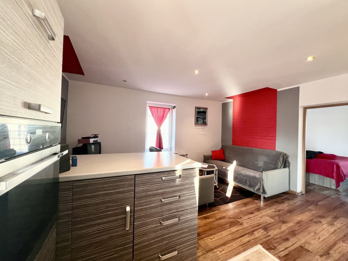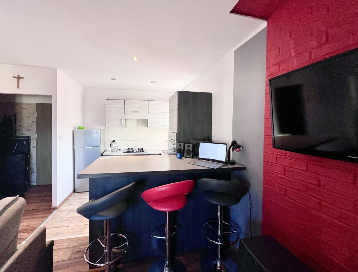 Lokal jest zadbany i przeszedł remont, w ramach którego wymieniono między innymi wszystkie okna. Wnętrze jest bardzo funkcjonalne i składa się z salonu z otwartą kuchnią, co optycznie powiększa przestrzeń, drugiego ustawnego pokoju oraz dużej, wygodnej łazienki. Ogromnym atutem oferty jest fakt, że mieszkanie sprzedawane jest z kompletnym wyposażeniem - cała zabudowa kuchenna, sprzęty AGD oraz meble widoczne na zdjęciach pozostają w cenie, co pozwala na wprowadzenie się bez dodatkowych nakładów finansowych.