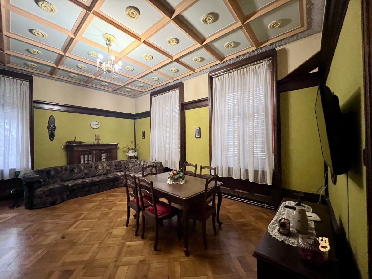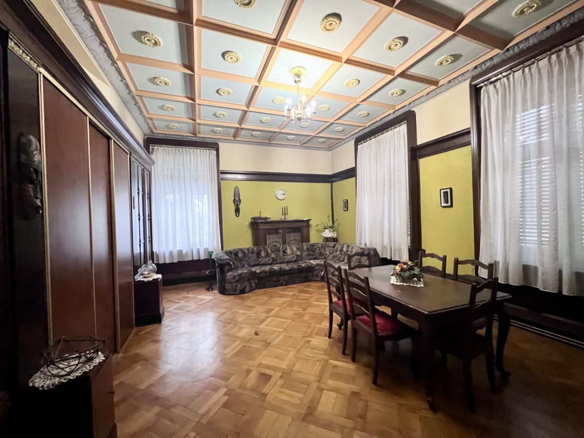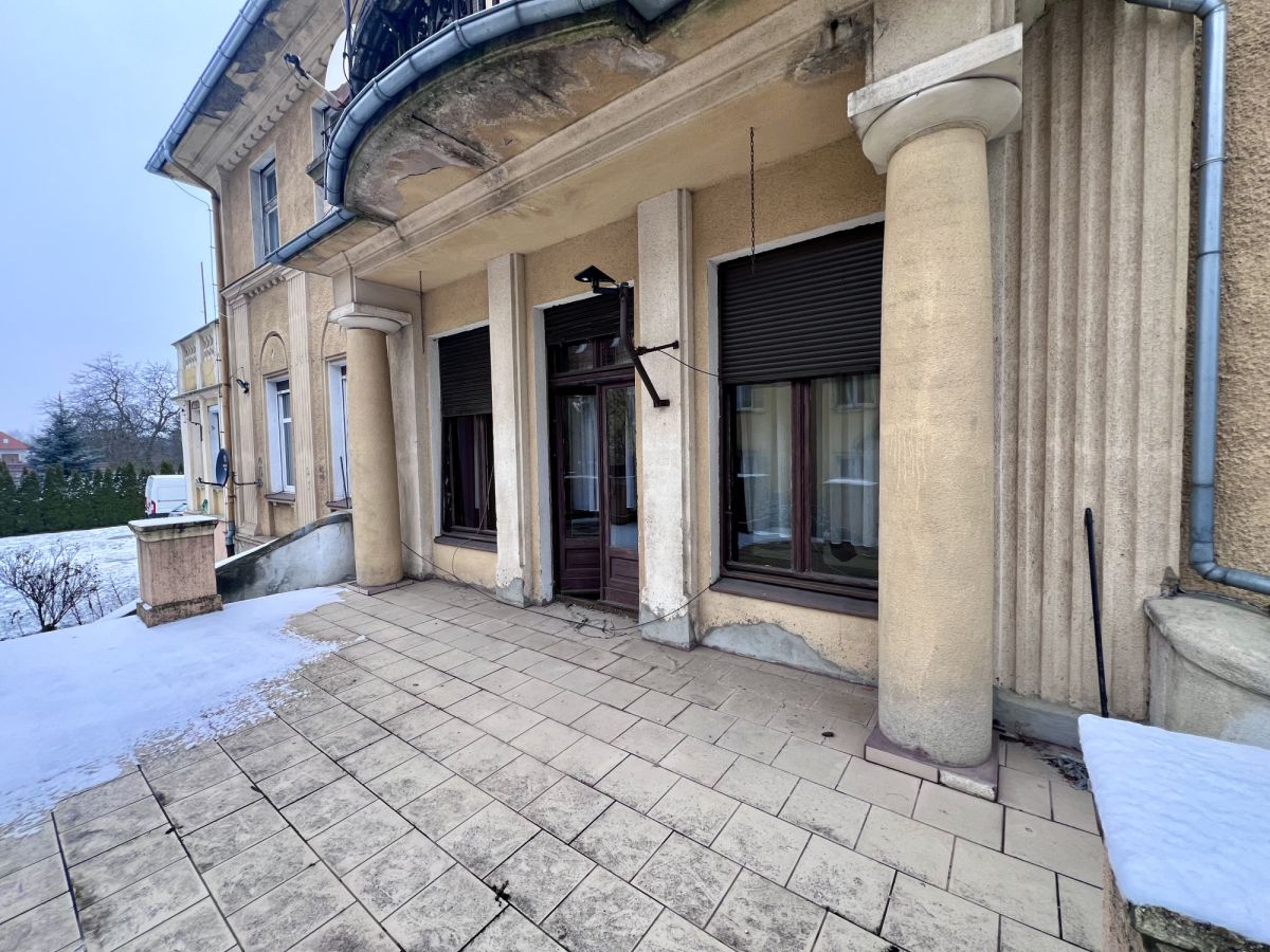 Po przekroczeniu progu od razu czuć wyjątkowość tego miejsca. Sercem domu jest imponujący salon, w którym uwagę przykuwają wysokie sufity, eleganckie drewniane boazerie oraz klasyczny kominek, idealny na chłodne wieczory. Z tego reprezentacyjnego pomieszczenia prowadzi wyjście na przepiękny, duży taras otoczony stylowymi kolumnami - to idealne miejsce na poranną kawę z widokiem na zieleń. Kolejne pokoje utrzymane są w równie podniosłym stylu, z czego jeden zachwyca unikalnym, kasetonowym sufitem. Do dyspozycji mieszkańców jest także duża, oddzielna i w pełni umeblowana kuchnia ze strefą jadalnianą, która pomieści całą rodzinę. Wnętrza te, choć wymagają odświeżenia lub własnej aranżacji, posiadają niepodrabialny charakter, którego nie znajdziemy w nowym budownictwie.