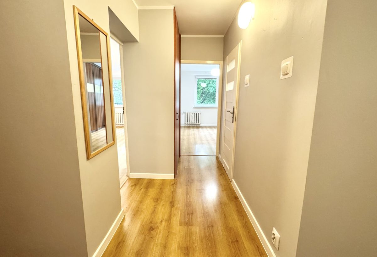 Mieszkanie składa się z trzech funkcjonalnych pokoi, osobnej przestronnej kuchni, łazienki, osobnego WC oraz przedpokoju. Do lokalu przynależy także balkon z ekspozycją południową oraz duża piwnica, co zapewnia dodatkową przestrzeń do przechowywania.